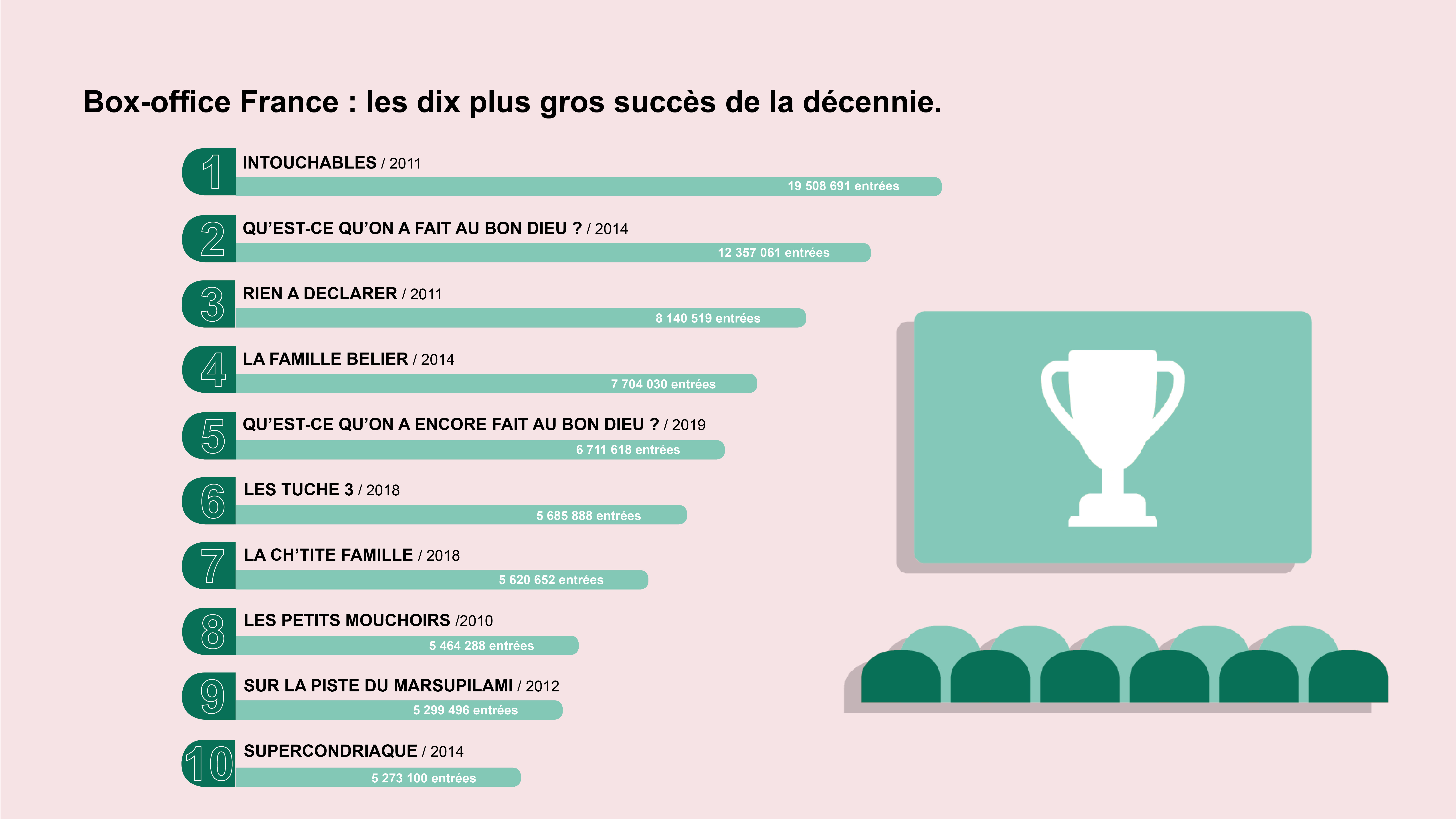 Cinéma 22 janvier 2020 Infographie : les 10 plus gros succès du box-office français de la décennie Alors que la décennie 2010-2019 vient de s’achever, retour en chiffres sur les dix plus gros succès du cinéma français de...